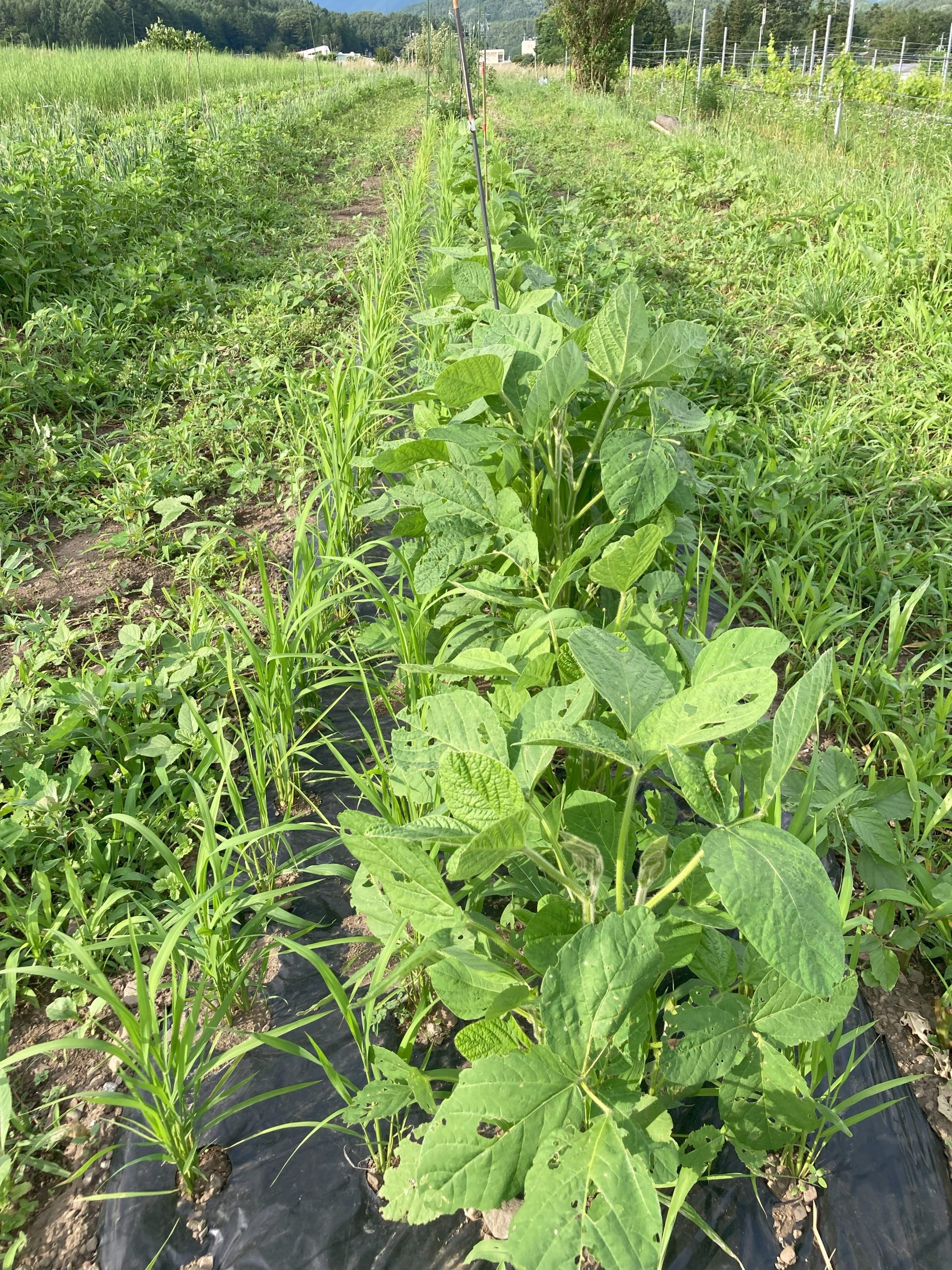 陸稲が10cmくらいに育って、定植したときはまだエダマメと陸稲はどちらも小さかったのですが、エダマメが陸稲を覆おうようになったところはエダマメの葉を落として陸稲の生育を遅らせないようにお世話しました。